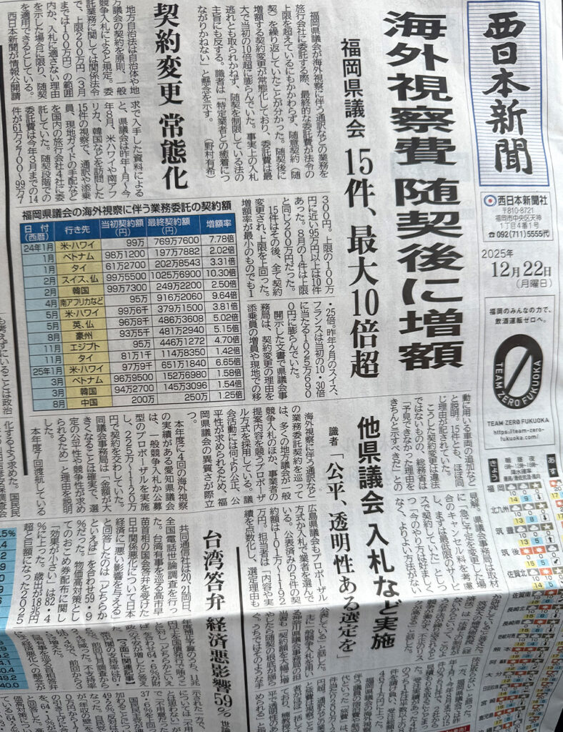 一部報道で海外視察に関する契約事務の問題が取り上げられています。私は召集がなく参加していませんが、県民への説明、検証、今後疑義を持たれないような適切かつ公平、透明性のある視察の企画、運営を求めていきます。