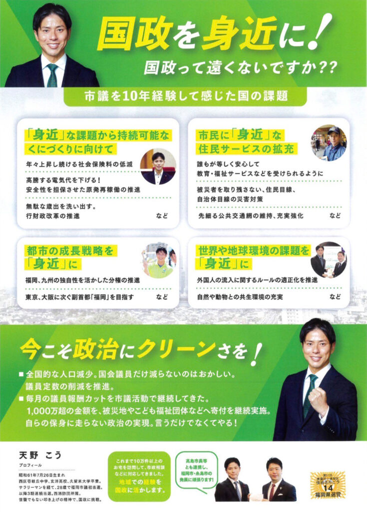 福岡市西区を含む福岡3区にて元福岡市議、日本維新の会 公認で天野こうが立候補いたしました。市民に最も身近な国会議員を目指して頑張っていただきます。