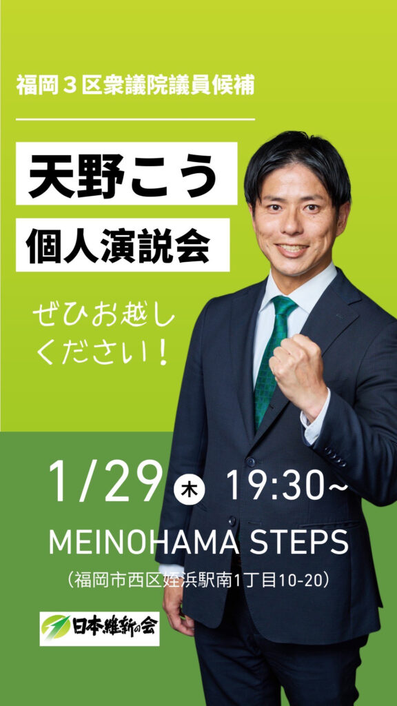 1月29日(木)19:30〜福岡市西区 姪浜STEPSにて個人演説会も開催します。お誘い合わせの上ご参加ください。
